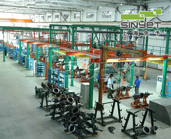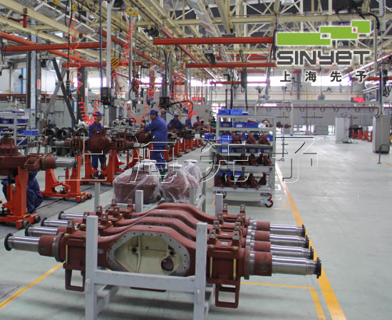工藝車橋生產(chǎn)線系統(tǒng)構(gòu)成: 生產(chǎn)線線體:板鏈或地拖鏈形式、臺車地下返回,由驅(qū)動裝置、張緊裝置、機架、鏈條、臺板等組成。 裝配臺車或支撐:根據(jù)要求設(shè)計,支撐間距可調(diào),可前橋、后橋單獨也可混流生產(chǎn)。 鋼結(jié)構(gòu):空中吊掛或地面立柱。 上線設(shè)備:天車或KBK輕便吊。 懸掛式軸承壓裝機:用于車橋兩端軸承的在線壓裝。 后橋翻轉(zhuǎn)機:方便安裝,用于裝配中的在線翻轉(zhuǎn)。 附帶工事:光帶照明、風(fēng)扇、工具滑軌、壓縮空氣管路等。 控制系統(tǒng):采用PLC控制。 生產(chǎn)總裝線:摩擦輥輪式線體、各類選墊機、壓裝機、擰緊機等。 其它:分裝線、驅(qū)動橋試驗機、差速器裝配線、擰緊機等設(shè)備。