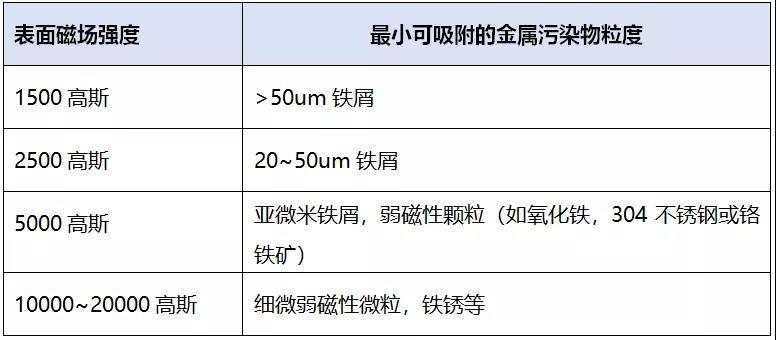 對(duì)于行業(yè)使用的磁棒,不同的強(qiáng)度吸附的異物類型和大小大致如下表所示: